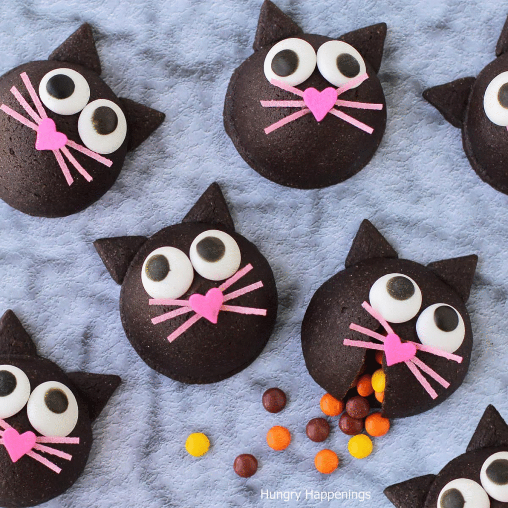 Next is the Wickedly Cute Halloween Treat Candy-Filled Black Cat Cookies from Hungry Happenings. Chocolate cats stuffed with candy are a match made in Halloween heaven, and they’re easy to bake!