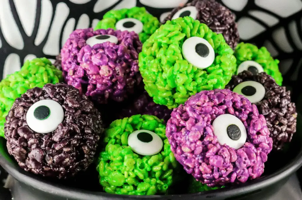Moving on to Monster Eye Balls Rice Krispie Bites from Two Sisters Crafting. These gooey rice treats with candy eyes are moist, fun, and easy to grab!